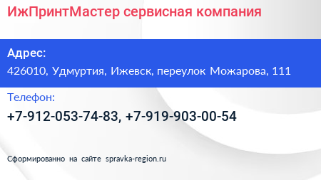 ИжПринтМастер, сервисная компания по адресу 426010, Удмуртия, Ижевск, переулок Можарова, 111 в дальнейшем Организация, размещена в следующих категориях: