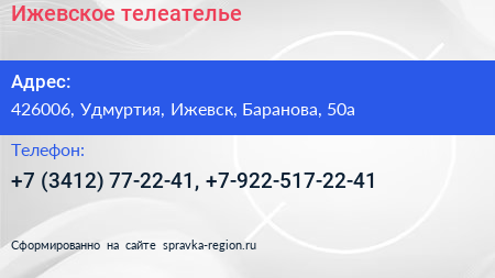 Ижевское телеателье по адресу 426006, Удмуртия, Ижевск, Баранова, 50а в дальнейшем Организация, размещена в следующих категориях: