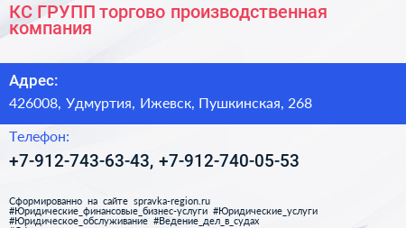 КС-ГРУПП, торгово-производственная компания по адресу 426008, Удмуртия, Ижевск, Пушкинская, 268 в дальнейшем Организация, размещена в следующих категориях: