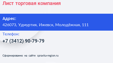 Лист, торговая компания по адресу 426073, Удмуртия, Ижевск, Молодёжная, 111 в дальнейшем Организация, размещена в следующих категориях: