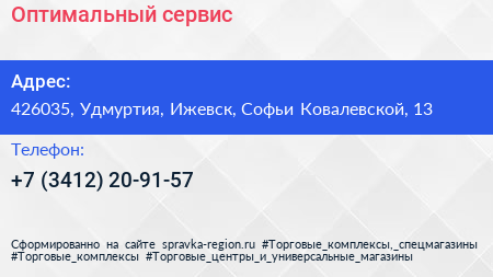 Оптимальный сервис по адресу 426035, Удмуртия, Ижевск, Софьи Ковалевской, 13 в дальнейшем Организация, размещена в следующих категориях: