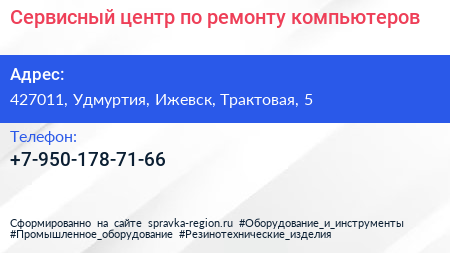 Сервисный центр по ремонту компьютеров по адресу 427011, Удмуртия, Ижевск, Трактовая, 5 в дальнейшем Организация, размещена в следующих категориях: