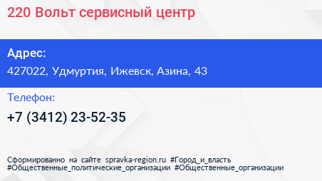 220 Вольт, сервисный центр по адресу 427022, Удмуртия, Ижевск, Азина, 43 в дальнейшем Организация, размещена в следующих категориях: