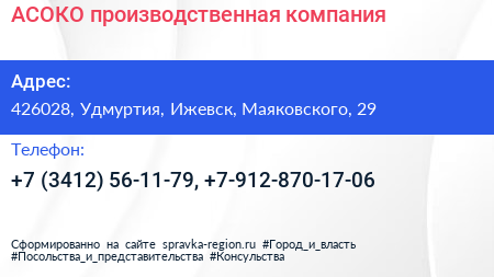 АСОКО, производственная компания по адресу 426028, Удмуртия, Ижевск, Маяковского, 29 в дальнейшем Организация, размещена в следующих категориях: