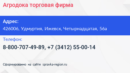 Агродока, торговая фирма по адресу 426006, Удмуртия, Ижевск, Четырнадцатая, 56а в дальнейшем Организация, размещена в следующих категориях: