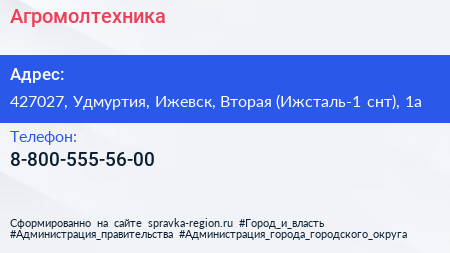 Агромолтехника по адресу 427027, Удмуртия, Ижевск, Вторая (Ижсталь-1 снт), 1а в дальнейшем Организация, размещена в следующих категориях: