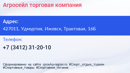 Агросейл, торговая компания по адресу 427011, Удмуртия, Ижевск, Трактовая, 16Б в дальнейшем Организация, размещена в следующих категориях: