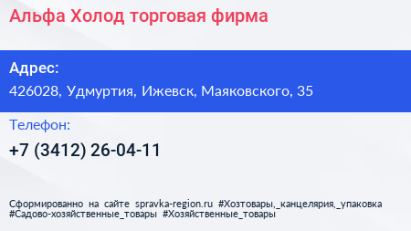 Альфа-Холод, торговая фирма по адресу 426028, Удмуртия, Ижевск, Маяковского, 35 в дальнейшем Организация, размещена в следующих категориях: