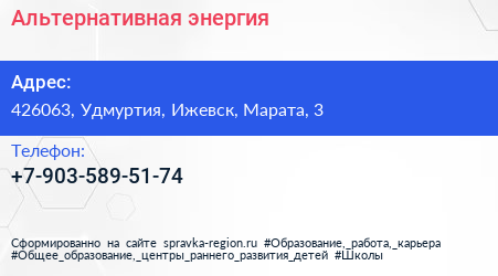 Альтернативная энергия по адресу 426063, Удмуртия, Ижевск, Марата, 3 в дальнейшем Организация, размещена в следующих категориях: