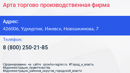 Арта, торгово-производственная фирма по адресу 426006, Удмуртия, Ижевск, Новоажимова, 7 в дальнейшем Организация, размещена в следующих категориях: