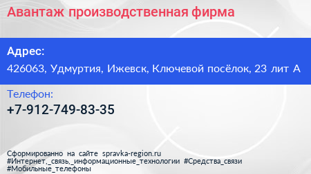 Авантаж, производственная фирма по адресу 426063, Удмуртия, Ижевск, Ключевой посёлок, 23 лит А в дальнейшем Организация, размещена в следующих категориях: