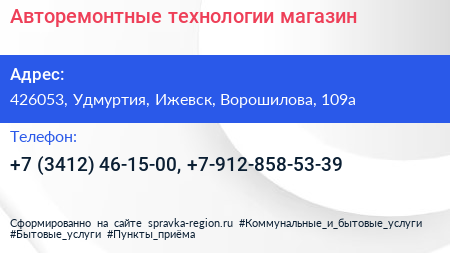 Авторемонтные технологии, магазин по адресу 426053, Удмуртия, Ижевск, Ворошилова, 109а в дальнейшем Организация, размещена в следующих категориях: