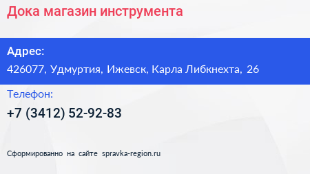 Дока, магазин инструмента по адресу 426077, Удмуртия, Ижевск, Карла Либкнехта, 26 в дальнейшем Организация, размещена в следующих категориях: