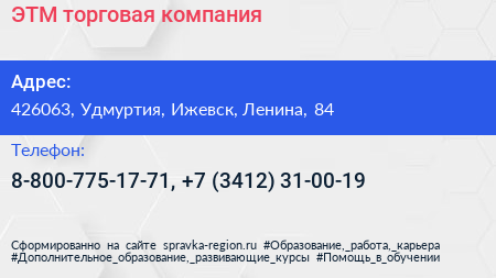 ЭТМ, торговая компания по адресу 426063, Удмуртия, Ижевск, Ленина, 84 в дальнейшем Организация, размещена в следующих категориях: