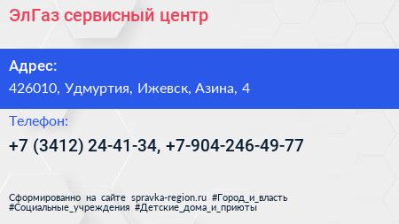 ЭлГаз, сервисный центр по адресу 426010, Удмуртия, Ижевск, Азина, 4 в дальнейшем Организация, размещена в следующих категориях: