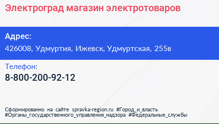 Электроград, магазин электротоваров по адресу 426008, Удмуртия, Ижевск, Удмуртская, 255в в дальнейшем Организация, размещена в следующих категориях: