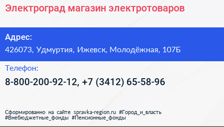 Электроград, магазин электротоваров по адресу 426073, Удмуртия, Ижевск, Молодёжная, 107Б в дальнейшем Организация, размещена в следующих категориях: