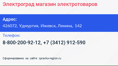 Электроград, магазин электротоваров по адресу 426072, Удмуртия, Ижевск, Ленина, 142 в дальнейшем Организация, размещена в следующих категориях:
