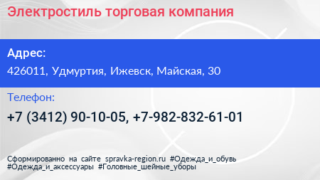 Электростиль, торговая компания по адресу 426011, Удмуртия, Ижевск, Майская, 30 в дальнейшем Организация, размещена в следующих категориях: