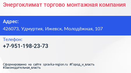 Энергоклимат, торгово-монтажная компания по адресу 426073, Удмуртия, Ижевск, Молодёжная, 107 в дальнейшем Организация, размещена в следующих категориях: