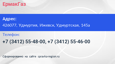 ЕрмакГаз по адресу 426077, Удмуртия, Ижевск, Удмуртская, 145а в дальнейшем Организация, размещена в следующих категориях: