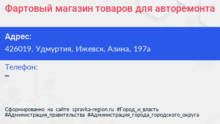 Фартовый, магазин товаров для авторемонта по адресу 426019, Удмуртия, Ижевск, Азина, 197а в дальнейшем Организация, размещена в следующих категориях: