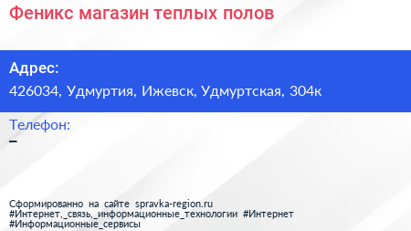 Феникс, магазин теплых полов по адресу 426034, Удмуртия, Ижевск, Удмуртская, 304к в дальнейшем Организация, размещена в следующих категориях: