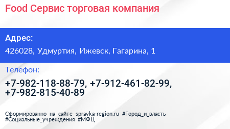 Food Сервис, торговая компания по адресу 426028, Удмуртия, Ижевск, Гагарина, 1 в дальнейшем Организация, размещена в следующих категориях: