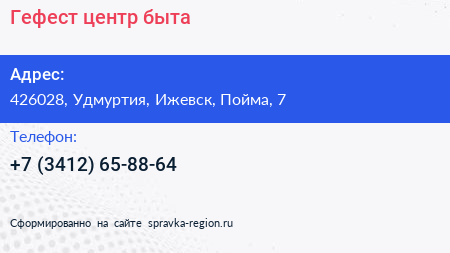 Гефест, центр быта по адресу 426028, Удмуртия, Ижевск, Пойма, 7 в дальнейшем Организация, размещена в следующих категориях: