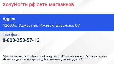 ХочуНогти.рф, сеть магазинов по адресу 426006, Удмуртия, Ижевск, Баранова, 87 в дальнейшем Организация, размещена в следующих категориях: