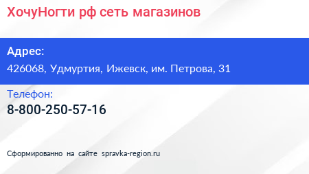 ХочуНогти.рф, сеть магазинов по адресу 426068, Удмуртия, Ижевск, им. Петрова, 31 в дальнейшем Организация, размещена в следующих категориях: