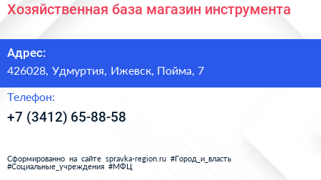 Хозяйственная база, магазин инструмента по адресу 426028, Удмуртия, Ижевск, Пойма, 7 в дальнейшем Организация, размещена в следующих категориях: