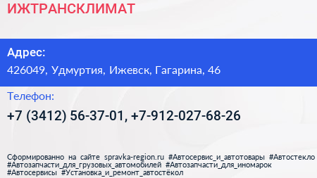 ИЖТРАНСКЛИМАТ по адресу 426049, Удмуртия, Ижевск, Гагарина, 46 в дальнейшем Организация, размещена в следующих категориях:
