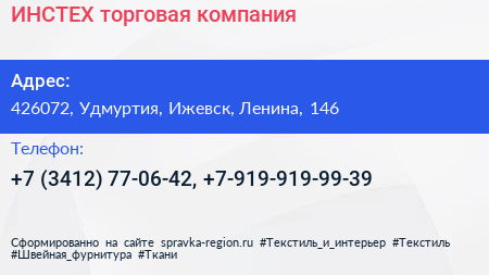ИНСТЕХ, торговая компания по адресу 426072, Удмуртия, Ижевск, Ленина, 146 в дальнейшем Организация, размещена в следующих категориях: