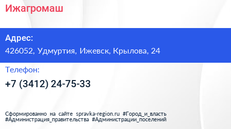 Ижагромаш по адресу 426052, Удмуртия, Ижевск, Крылова, 24 в дальнейшем Организация, размещена в следующих категориях: