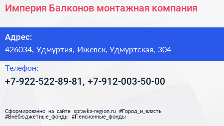 Империя Балконов, монтажная компания по адресу 426034, Удмуртия, Ижевск, Удмуртская, 304 в дальнейшем Организация, размещена в следующих категориях: