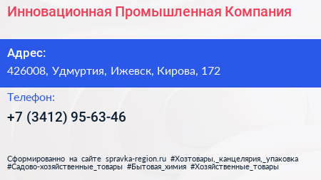 Инновационная Промышленная Компания по адресу 426008, Удмуртия, Ижевск, Кирова, 172 в дальнейшем Организация, размещена в следующих категориях: