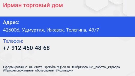 Ирман торговый дом по адресу 426006, Удмуртия, Ижевск, Телегина, 49/7 в дальнейшем Организация, размещена в следующих категориях: