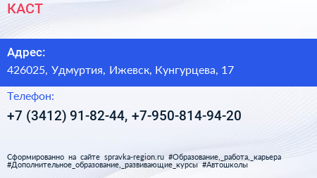 КАСТ по адресу 426025, Удмуртия, Ижевск, Кунгурцева, 17 в дальнейшем Организация, размещена в следующих категориях: