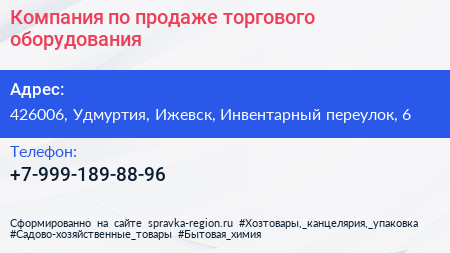 Компания по продаже торгового оборудования по адресу 426006, Удмуртия, Ижевск, Инвентарный переулок, 6 в дальнейшем Организация, размещена в следующих категориях: