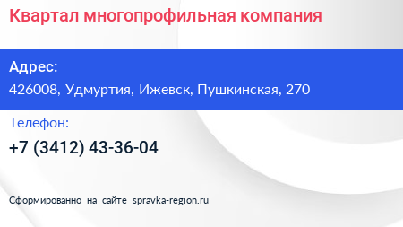 Квартал, многопрофильная компания по адресу 426008, Удмуртия, Ижевск, Пушкинская, 270 в дальнейшем Организация, размещена в следующих категориях: