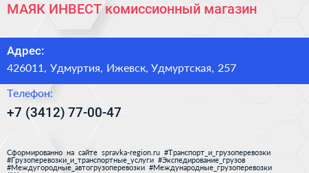 МАЯК-ИНВЕСТ, комиссионный магазин по адресу 426011, Удмуртия, Ижевск, Удмуртская, 257 в дальнейшем Организация, размещена в следующих категориях: