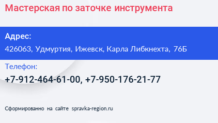 Мастерская по заточке инструмента по адресу 426063, Удмуртия, Ижевск, Карла Либкнехта, 76Б в дальнейшем Организация, размещена в следующих категориях: