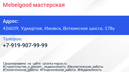 Mebelgood, мастерская по адресу 426039, Удмуртия, Ижевск, Воткинское шоссе, 178у в дальнейшем Организация, размещена в следующих категориях: