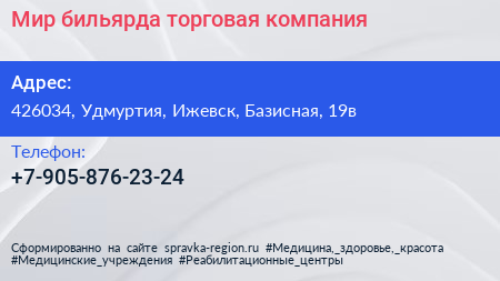 Мир бильярда, торговая компания по адресу 426034, Удмуртия, Ижевск, Базисная, 19в в дальнейшем Организация, размещена в следующих категориях:
