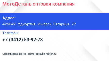 МотоДеталь, оптовая компания по адресу 426049, Удмуртия, Ижевск, Гагарина, 79 в дальнейшем Организация, размещена в следующих категориях: