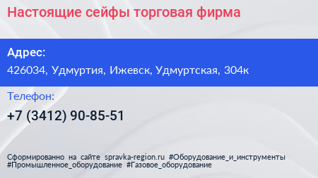 Настоящие сейфы, торговая фирма по адресу 426034, Удмуртия, Ижевск, Удмуртская, 304к в дальнейшем Организация, размещена в следующих категориях: