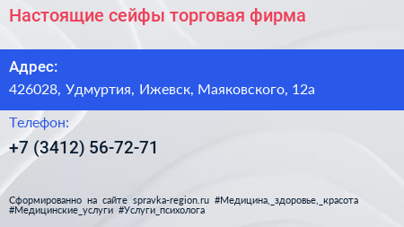 Настоящие сейфы, торговая фирма по адресу 426028, Удмуртия, Ижевск, Маяковского, 12а в дальнейшем Организация, размещена в следующих категориях: