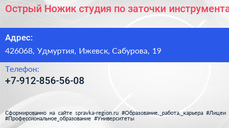 Острый Ножик, студия по заточки инструмента по адресу 426068, Удмуртия, Ижевск, Сабурова, 19 в дальнейшем Организация, размещена в следующих категориях: