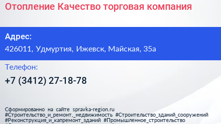 Отопление Качество, торговая компания по адресу 426011, Удмуртия, Ижевск, Майская, 35а в дальнейшем Организация, размещена в следующих категориях: